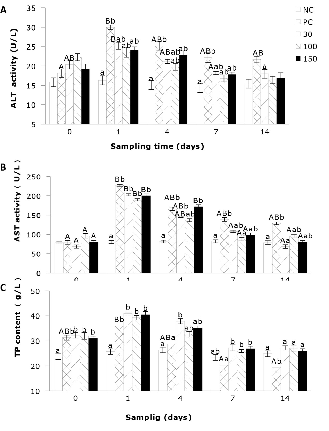 Plasma biochemical analysis. Serum alanine transaminase (ALT), aspartate transaminase (AST) and alkaline phosphatase (AKP) activities were measured by the IFCC method. The total protein (TP) content was determined by direct assay and the glucose (Glu) level was measured using the photocolorimetric method. All these kits were bought from Shenzhen Mindray Bio-Medical Electronics Co., Ltd. The measurements were conducted in a Mindray Auto Bio-chemical Analyzer (BS-400, Mindray, P.R. China).