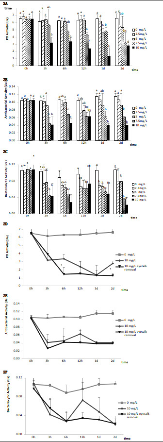 The current study demonstrated that eyestalk ablation in shrimp led to a decrease in blood parameters such as PO activity compared to non-eyestalk-ablated shrimp under the same conditions. Consistently, a reduction in total hemocyte count was observed in unilaterally ablated female Farfantepenaeus paulensis35 and in L. vannamei.36 Therefore, our results suggest that eyestalk hormones mediate a protective immune response against nitrite stress in L. vannamei. Further investigations are required to elucidate the mechanism by which CHH modulates immune functions in shrimp to protect against nitrite stress.