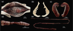 A. laticeps ventral and dorsal scales are small, and the body side scales are larger. There is a line of extra-large anal fins on both sides of the anus and the gluteal fin base, and the gluteal scales are developed (Figure 9-a). Wide mouth, front ; the mandible is longer than the maxilla and has no horny margin. The hypopharyngeal teeth are columnar, and the apex is sharp and slightly curved. There are three rows of pharyngeal teeth, tooth type 2·3·5 ~ 5·3·2, gill raker outer row 11 ~ 14, inner row 15 ~ 18 (Figure 9-b,c). The swim bladder in A. laticeps has two chambers, the anterior chamber is enlarged, and the length of the posterior chamber is about 1.6 times that of the anterior chamber (Figure 9-d). The intestine is short, only 1.2 times the body length (Figure 9-e).