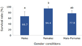 SR was observed in the female group (94.4%), followed by the mixed-sex group (77.8%), while the lowest SR was found in the male group (66.7%). The SR in the female group (94.4%) was very high, and ANOVA analysis indicated a significant reduction in survival rates for the male group compared to the female group (p < 0.05) (Figure 5).
