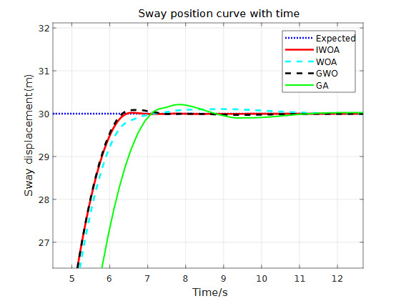 In the sway direction response curve, after the disturbance is introduced, both the GA-ADRC and WOA-ADRC methods respond more slowly (approximately 2 seconds later than the previous two methods) and exhibit some steady-state error. The IWOA-ADRC and GWO-ADRC methods have the fastest initial response and shorter times to restore lateral stability (4.311s and 4.975s after disturbance, respectively). However, the GWO-ADRC method has a larger overshoot. In contrast, the IWOA-ADRC method reduces the system’s overshoot by up to 10%.