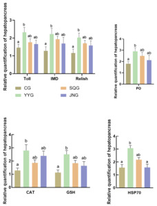 As shown in Figure 3, compared with the CG, the relative expression levels of Toll, IMD, and Relish in the hepatopancreas of P. monodon in the YYG were significantly enhanced (P < 0.05). There were also increases in SQG and JNG, but these were not statistically significant (P > 0.05). As depicted in Figure 3, when compared with the CG, the relative expression levels of CAT, GSH, and hsp70 in the hepatopancreas of the YYG were significantly increased (P < 0.05).