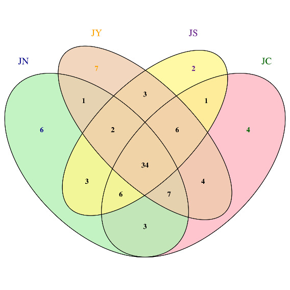 Compared with CG, the weight gain (WG), survival rate (SR), specific growth rate (SGR), and feed efficiency ratio (FER) of the experimental groups increased (Table 2). Among them, the WG, SR, SGR, and FER of the YYG were significantly higher than those of the CG (P < 0.05). There were no significant differences in WG, SR, SGR, and FER between the SQG and JNG compared with the CG (P > 0.05). Additionally, there were no significant differences in crude nutrient composition among P. monodon from the CG and the experimental groups (P > 0.05) (Table 3).