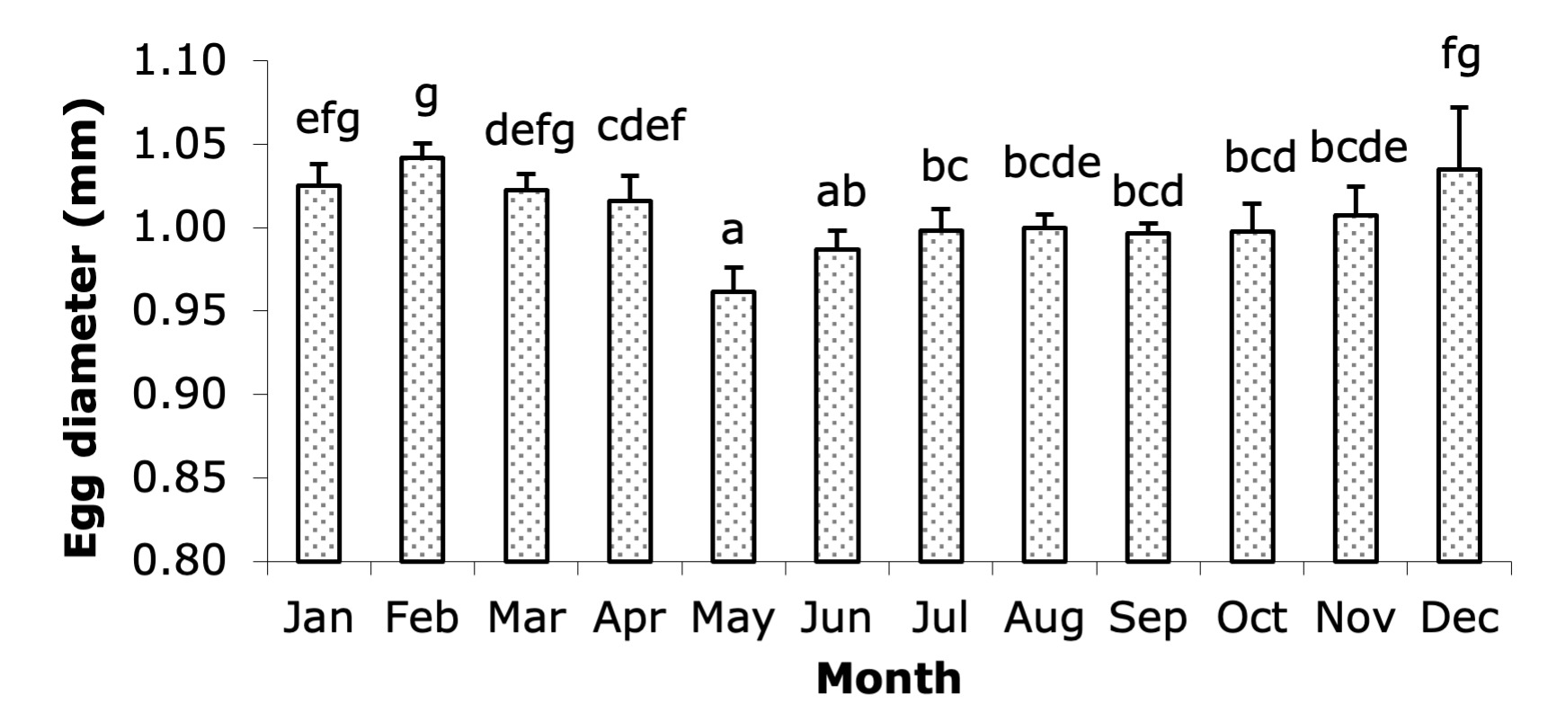 From each female, 30 randomly selected eggs were measured using a microscope equipped with a digital camera and ImageJ software. The egg diameter, including the vitelline membrane, was measured at the widest point.