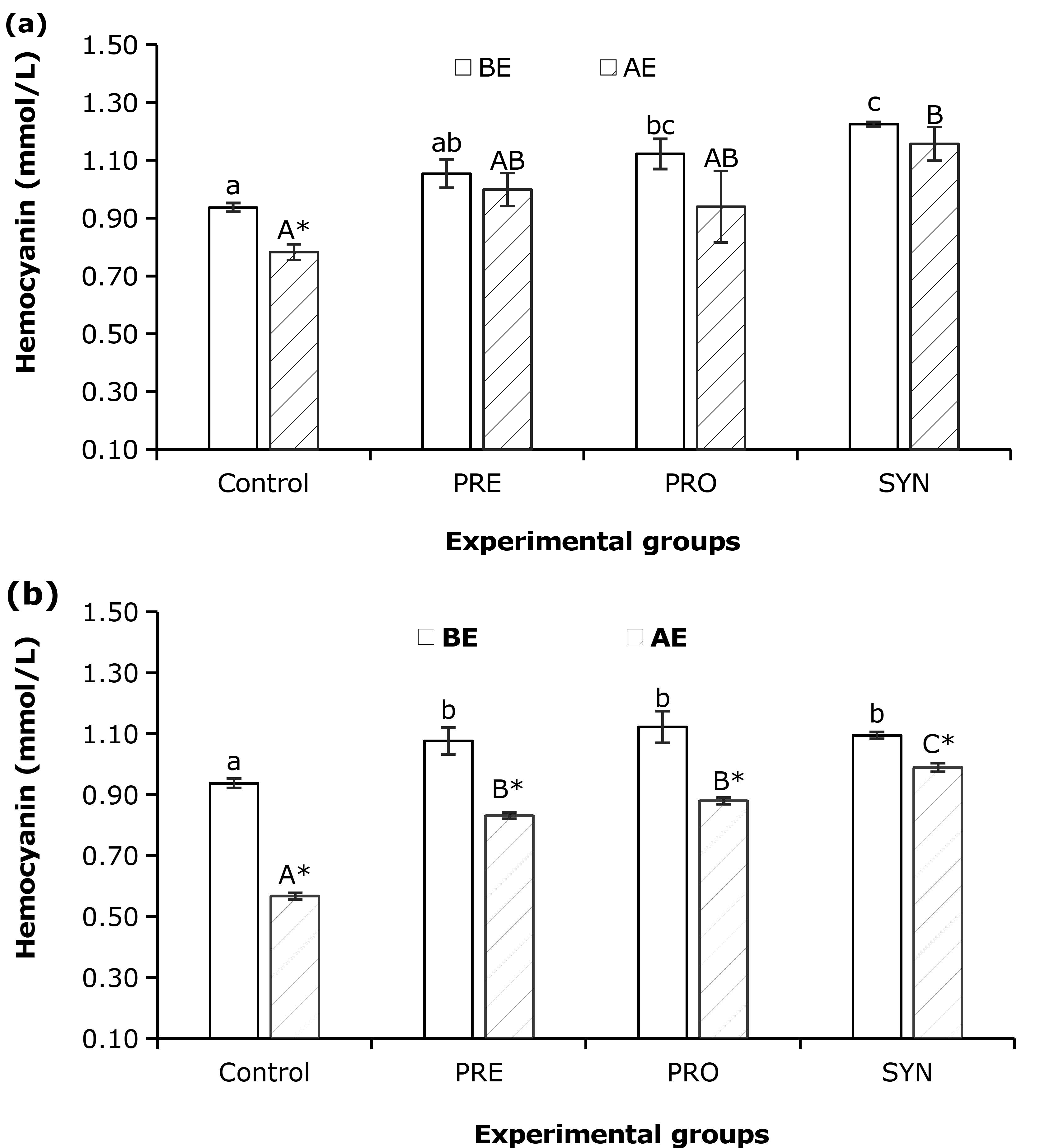 The SYN treatment exhibited the highest amount of hemocyanin, whereas the control treatment showed the lowest level of hemocyanin before and after exposure to low salinity (p < 0.05) (Fig. 3). No significant difference was observed in each treatment under both conditions, except in the control treatment. As for the ammonia test, hemocyanin concentrations in the control group were significantly different as compared to PRE, PRO and SYN treatments under both conditions. The values in all treatments were lower in post-exposure compared to pre-exposure conditions, which was statistically significant under both conditions from each treatment.