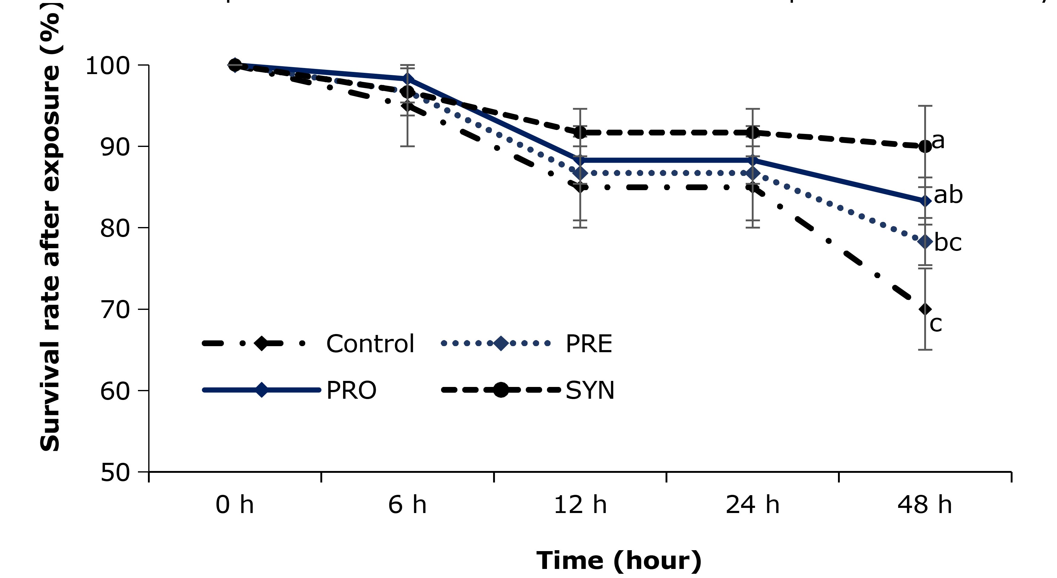 After 48 h of exposure to high ammonia levels, the mean survival rate of shrimp in the SYN group was 90%, while the mean values for the shrimp in PRO, PRE, and the control groups were 83.3%, 78.3% and 70%, respectively (Fig. 4). Among them, the survival rates in the PRO and SYN groups significantly increased compared to the control group (p < 0.05, Fig. 4). From 6 h to 24 h of exposure, survival rates in the PRO, PRE, and SYN groups were numerically higher than in the control group, but the differences were not statistically significant. The survival rate of shrimp in all treatments was 100% after 48 h of exposure to low salinity stress.