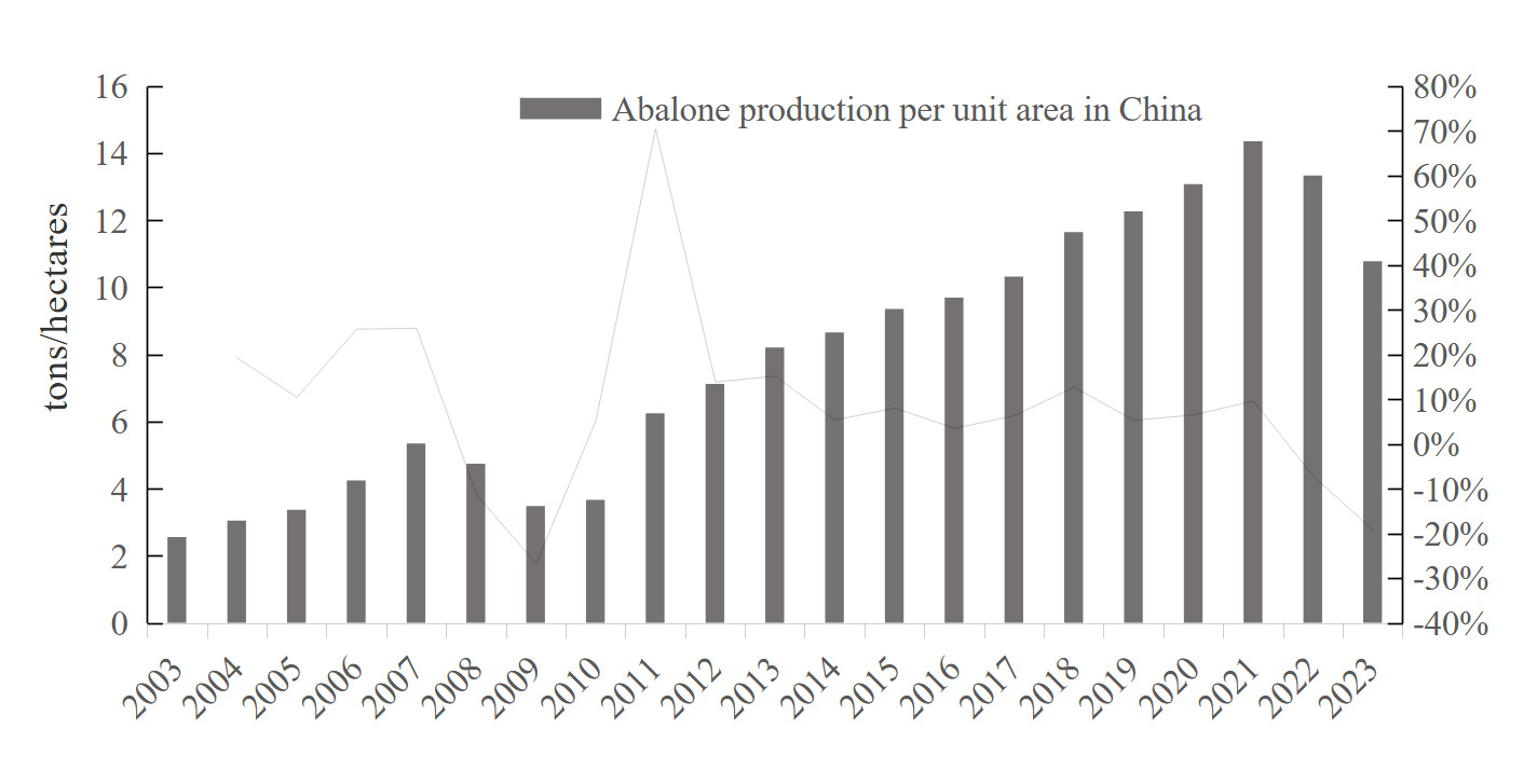 China’s abalone industry has demonstrated remarkable efficiency in yield per unit area.14 Over the past 20 years, with few exceptions, abalone production per unit area has generally increased, often recovering quickly from brief fluctuations. As shown in Figure 4, yield per unit area experienced notable volatility before 2010, initially rising and then declining. However, since 2011, breeding efficiency has improved significantly, resulting in sustained medium-to-high growth. By 2021, the unit yield reached a peak of 14.35 tons per hectare. Although the 2022 yield may have declined due to the pandemic’s impact, it still reflects a 321.71% increase compared to 2003. Over the past two decades, the average annual growth rate has been 7.46%.