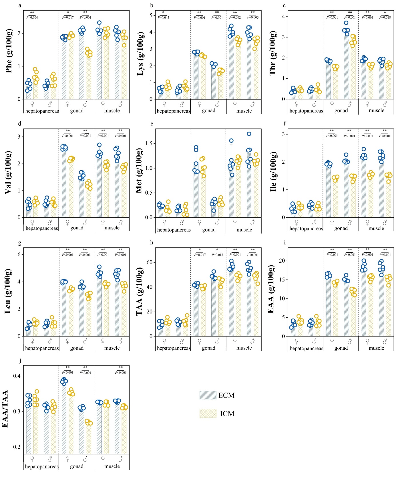 Figure 4 presents a comparative analysis of the concentrations of seven essential amino acids and the indices for amino acid nutritional evaluation in the edible tissues of E. sinensis cultivated under two distinct aquaculture models. In the female hepatopancreas, the levels of phenylalanine (Phe) and lysine (Lys) were significantly lower in crabs from the extensive culture model (ECM) compared to those from the intensive culture model (ICM) (p<0.05). The gonadal tissues of ECM crabs exhibited significantly higher total amino acid (TAA) content, essential amino acid (EAA) content, and EAA/TAA ratio than those of ICM crabs (p<0.05). Notably, female ECM gonads had reduced Phe levels compared to their ICM counterparts (p<0.05), whereas male ECM gonads showed increased Phe content relative to ICM males (p<0.05). Furthermore, the concentrations of Lys, threonine (Thr), valine (Val), isoleucine (Ile), and leucine (Leu) were significantly higher in ECM gonads than in ICM gonads (p<0.05). Muscle tissues of ECM crabs demonstrated significantly higher TAA and EAA contents compared to those of ICM crabs (p<0.05). Additionally, male ECM crabs exhibited a higher EAA/TAA ratio in muscle tissue than ICM males (p<0.05). Moreover, ECM muscle tissues showed elevated levels of Lys, Thr, Val, Ile, and Leu compared to those of ICM crabs (p<0.05).