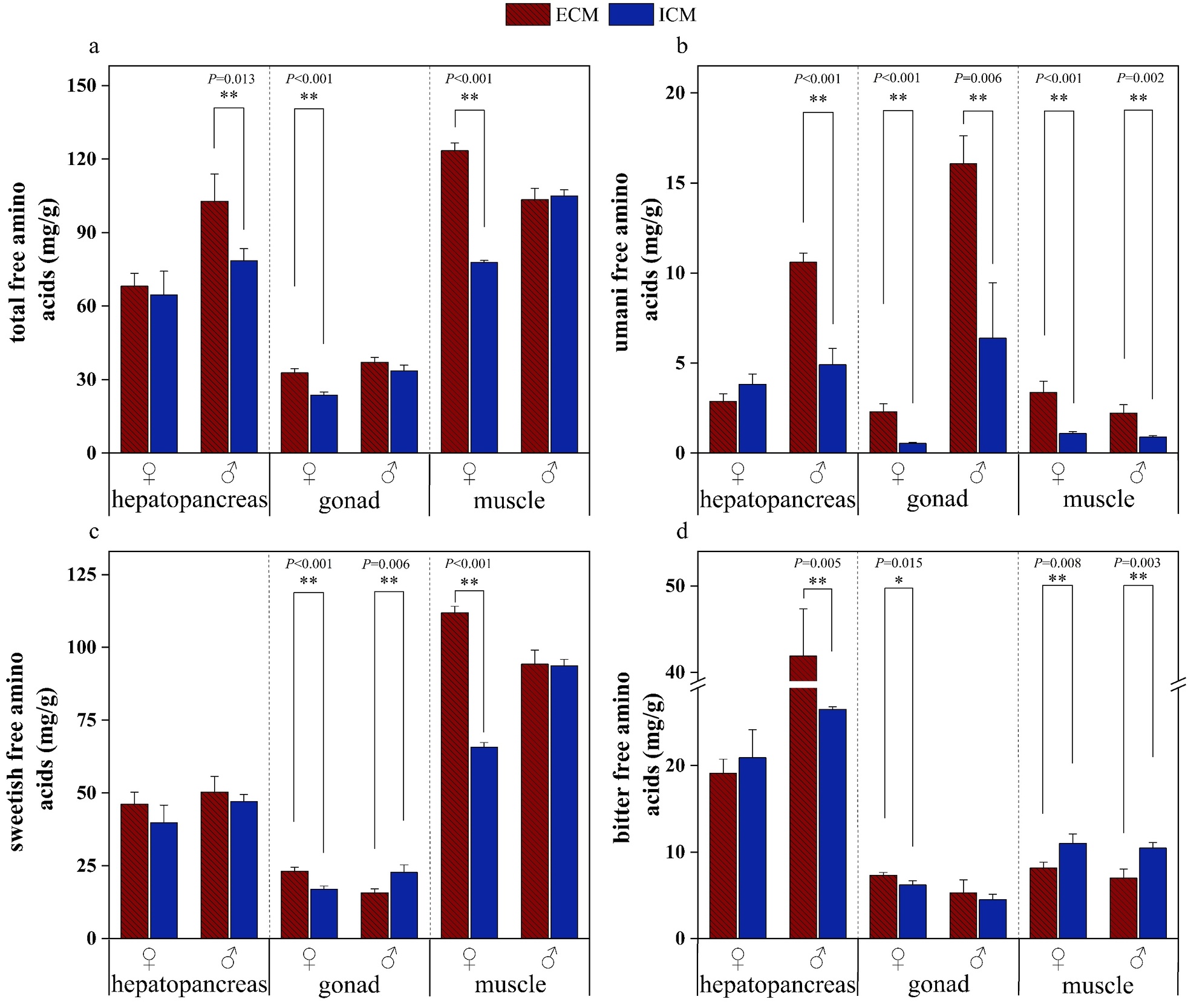 Glutamic acid (Glu), alanine (Ala), arginine (Arg), and histidine (His) were identified as the predominant flavor-active amino acids in both aquaculture models. ECM crabs displayed higher TAVs for all FAAs in the hepatopancreas, suggesting a more complex flavor profile. The gonads of ECM crabs exhibited pronounced umami characteristics, with elevated TAVs across FAAs, indicating enhanced flavor richness. Female ECM muscle tissues demonstrated stronger umami and sweetness attributes, while male ECM muscle tissues showed intensified umami characteristics. Overall, ECM muscle exhibited a more diverse flavor profile compared to ICM counterparts.