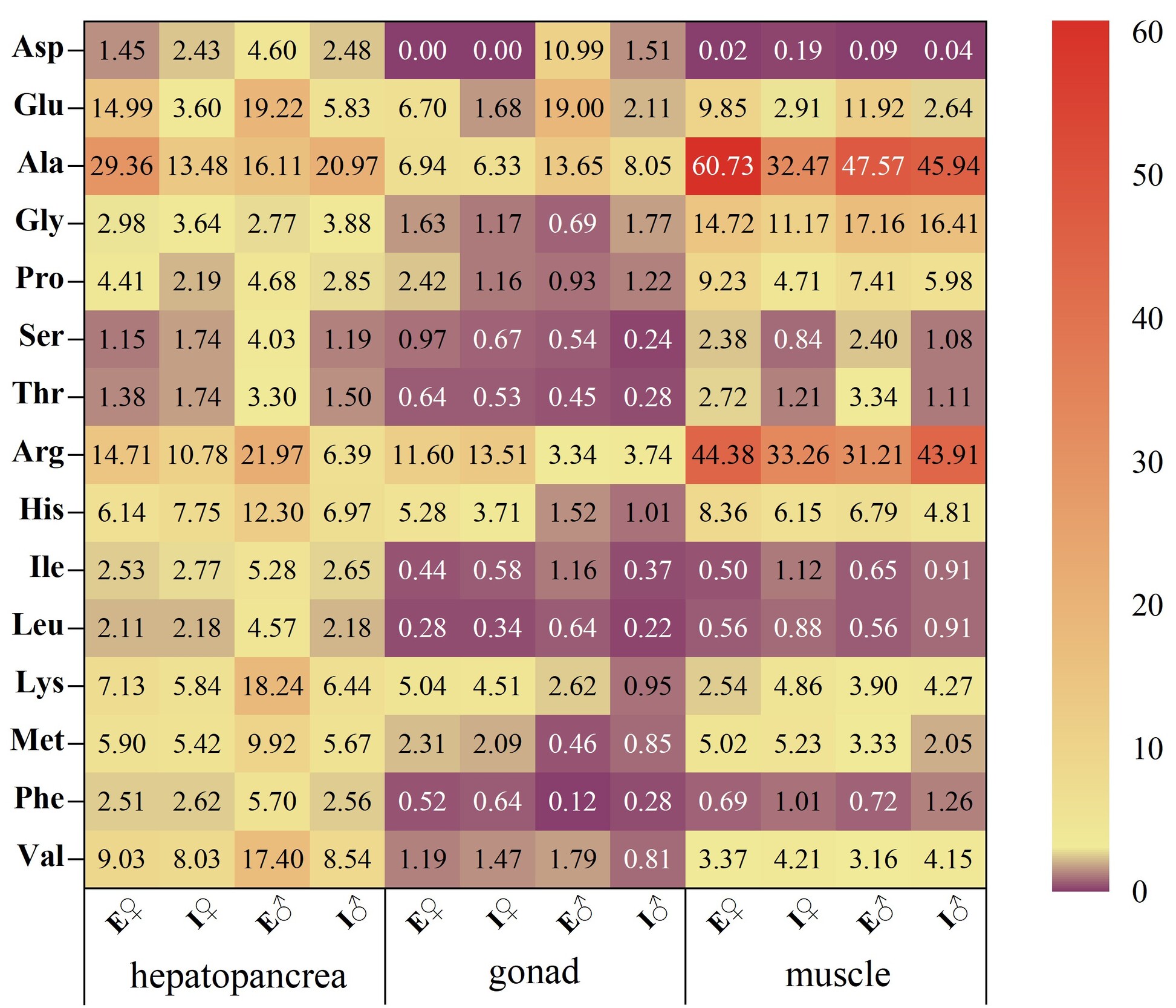 This work was supported by the National Key Research and Development Program of China (No.2023YFD2400505), the Key Research and Development Program of Hubei Province: (No.2023BBB084) and the Yellow River Delta Industry Leading Talent Project (No. DYRC20200215). The authors thank Ms. Jun Men and Ms. Yanxia Zuo (the Center for Instrumental Analysis and Metrology, Institute of Hydrobiology, Chinese Academy of Science) for technical assistance in the measurement of Amino Acids, Free Amino Acids and Fatty Acids.