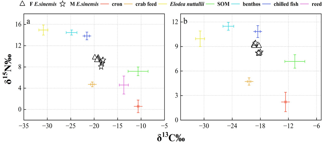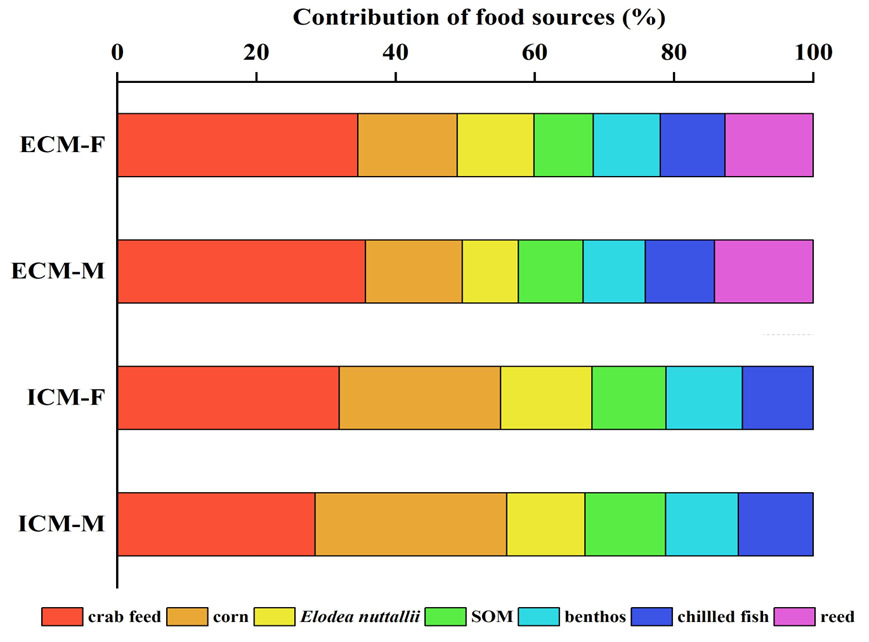 For ICM crabs, the δ¹³C isotopic values of their food sources similarly ranged from -30.83‰ to -10.62‰, maintaining a difference of 20.21‰ (Figure 8). The δ¹⁵N values for this group spanned from 2.21‰ to 11.47‰, with an overall range of 9.26‰. In female ICM crabs, formulated feed was the primary dietary component, comprising 31.9% of their intake, followed by corn (23.2%), Elodea nuttallii (13.1%), benthic animals (11.0%), SOM (10.6%), and frozen trash fish (10.2%). Male ICM crabs predominantly consumed formulated feed as well, which constituted 28.4% of their diet, with additional contributions from corn (27.5%), SOM (11.5%), Elodea nuttallii (11.3%), frozen trash fish (10.7%), and benthic animals (10.5%).