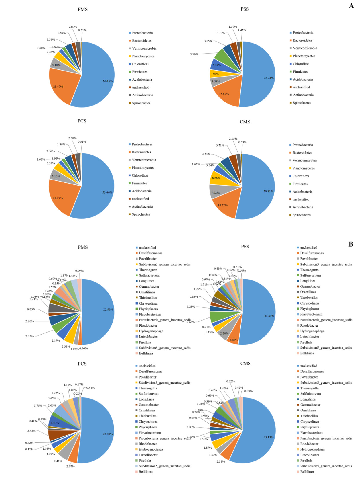A total of 785219 raw sequences, including 1600 chimeras, 160 out-targets, 335175 organelles, and 448284 filtered sequences, from 12 samples (3 samples for each group) from the water of different culture groups were obtained after the Illumina sequencing of the V3–V4 segments of the 16s rRNA gene. In sediment, a total of 708925 sequences, including 3597 chimeras, 183 out-targets, 24491 organelles, and 680654 filtered sequences, were obtained for sediment samples after the Illumina sequencing of the V3–V4 segments of the 16s rRNA gene (Table 2). Sequences with ≥97% similarity were assigned to the same OTUs for further annotation. The average OTUs of different culture groups (PM, PS, PC, and CM) were 2091, 3961, 3805, and 4001 (Fig. 2A), whereas the average OTUs in sediment of different culture groups were significantly higher (PMS = 14262, PSS = 13370, PCS = 11462, and CMS = 13496) than those in water (Fig. 2B).