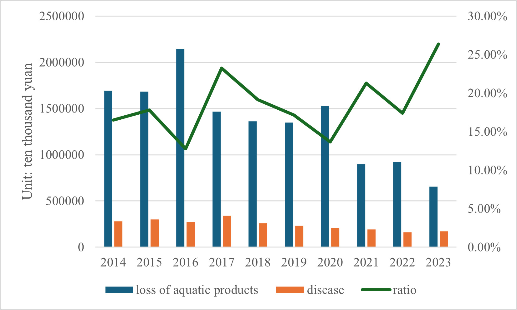 One of the major threats facing the aquaculture industry is disease outbreaks. Diseases such as white spot disease and streptococcal infections, once they occur, often result in significant losses of aquatic products. As shown in Figure 5, the proportion of aquatic product losses caused by diseases fluctuated significantly between 2014 and 2023, with particularly high loss rates in years such as 2017 and 2023. Many small and medium-sized aquaculture farms lack adequate quarantine and monitoring systems due to limited funds and outdated technology. This makes it difficult for them to detect diseases early and implement effective control measures, leading to rapid disease spread and severe impacts on aquaculture production. For example, the white spot disease virus spreads rapidly, and once it infects a shrimp farming population, it can cause mass shrimp deaths in a short period, resulting in significant economic losses for farmers.