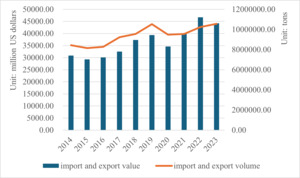 For export-oriented farms, currency depreciation or export restrictions in the target market may directly impact revenue. Additionally, exchange rate fluctuations and changes in trade policies are closely linked to the import and export of aquaculture products, as evidenced by the fluctuations in import and export volumes and values of aquaculture products from 2014 to 2023, as shown in Figure 2. During this period, the total volume of imports and exports generally increased, with import and export values fluctuating accordingly. When the currency of the target market depreciates, even if import and export volumes remain stable or increase, the value of imports and exports calculated in local currency may decrease due to exchange rate conversion issues. For example, if the currency of the target market depreciates relative to the local currency during a period of rising import and export volumes, the value of export revenue converted back to local currency will decrease, directly compressing the profit margin of aquaculture projects.