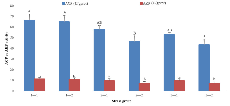 In conclusion, the SOD, ACP, and AKP activities of groups 2 and 3 at 192 h were significantly lower than that of group 1 at 96 h and 192 h, whereas the MDA index of groups 2 and 3 was significantly higher than that of group 1 at 96 h and 192 h.