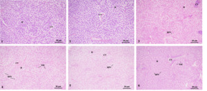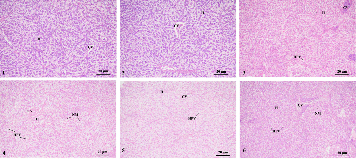 The histology showed that liver cells in group 1 (1-1 and 1-2 groups) were arranged neatly and had clear cell contours. However, in groups 2-1 and 3-1, some liver cells appeared large areas of vacuolization. Moreover, groups 2-2 and 3-2 had dilated sinusoids, swollen liver cells, severe vacuolization, and a severe nuclear shift. That was, with an increase in stress time, the swelling, vacuolization, and nuclear shift of liver cells gradually worsened (Fig. 3).