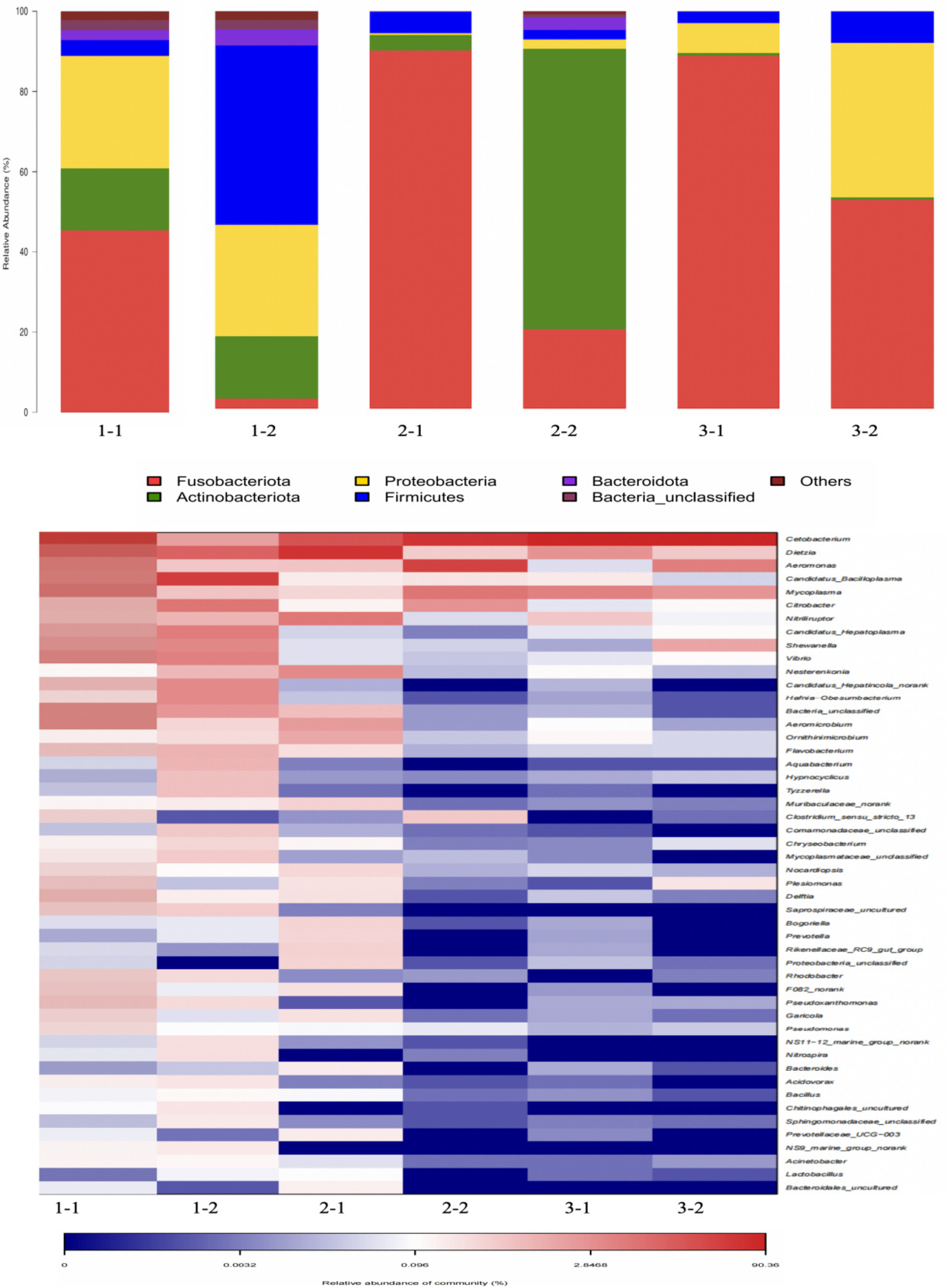 The results showed that the gut microbiota of M. salmoides mainly included Fusobacteriota, Proteobacteria, Actinobacteria, and Firmicutes. Among them, Fusobacteriota, Proteobacteria, and Actinobacterota were more abundant in group 1-1. Firmicutes, Proteobacteria, and Actinobacterota were more abundant in group 1-2. Fusobacteriota were the most abundant phyla in group 2-1. Actinobacterota and Fusobacteriota were more abundant in group 2-2. Fusobacteriota, Proteobacteria and Firmicutes were more abundant in group 3. In other words, at the phylum level, after high salinity and moderate pH stress, the abundance of the phyla Proteobacteria decreased, while the abundance of the phyla Fusobacteriota increased at 96 h, however, the abundance of the phyla Fusobacteriota decreased, while the abundance of the phyla Actinobacteria increased at 192 h. Besides, after high pH and moderate salinity stress, the abundance of Actinobacteria increased at 96 h; however, it decreased at 192 h. At 192 h, except for Fusobacteriota, Proteobacteria, and Firmicutes, there is almost no other phyla. In conclusion, after high salinity and moderate pH stress, Proteobacteria decreased at first, and then increased; Fusobacteriota increased at first and then decreased. After high pH and moderate salinity stress, Actinobacteria increased at first, and then decreased. Besides, the main phyla were becoming increasingly concentrated.