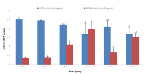 The results showed that during the breeding period, none of the fish in each group die. However, in groups 2 and 3, we observed that during the initial stage of stress, some fish began to show signs of stress: rapid breathing, an increased frequency of gill opening and closing, and hyperactive behavior. As the level of stress increased (especially at 192 h), some fish frequently rolled or collided and darted about before resting at the bottom.