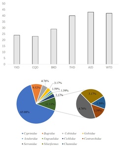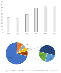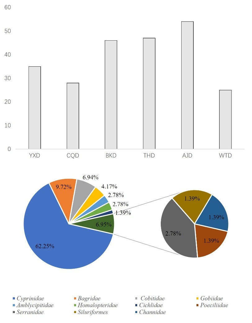 In June, we used eDNA technology to detected 72 species of fish in six sections of the Fujiang River. They belong to 11 families and 52 genuses. It includes two species, Leptobotia elongate and Procypris rabaudi, which are both classified as second-level protected animals in the country. They also include five types of municipal key protected fish species: Liobagrus marginatus, Xenocypris fangitchang, Ochetobius elongatus, Leptobotia microphthalma, and Leptobotia taeniops. There are 15 species of fish unique to the upper reaches of the Yangtze River Leptobotia elongata, Procypris rabaudi, Xenocypris fangitchang, Leptobotia microphthalma, Hemiculterella sauvagei, Paracobitis potanini, Ancherythroculter kurematsui, Ancherythroculter nigrocauda, Megalobrama Pellegrini, Botia reevesae, Liobagrus marginatoides, Sinogastromyzon sichangensis, Rhinogobio cylindricus, Acrossocheilus monticolus, Hemiculter tchangi. There are 5 invasive species: Mrigalcarp, Pseudohemiculter dispar, Coptodon zillii, Gambusia affinis, Silver prussian carp. The most common family was Cyprinidae with 47 species, accounting for 65.28%; the second family was Bagridae with 7 species, accounting for 9.72%; the proportion of fish species that are herbivorous was 29.60% (Figure 2).