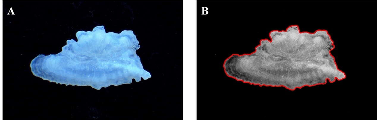 Left sagittae were placed with the distal surface down, showing the sulcus up and the rostrum pointing to the right. Digital images of otoliths were captured using a stereomicroscope (Motic SM171, Motic, China) with a digital camera (Moticam S6, Motic, China). Images were captured at a resolution of 1280 × 1024 pixels and saved as TIFF files. To ensure accurate measurements, a scale bar was included in each image for subsequent calibration (scaling). High-contrast digital images were obtained using reflected light against a dark background.