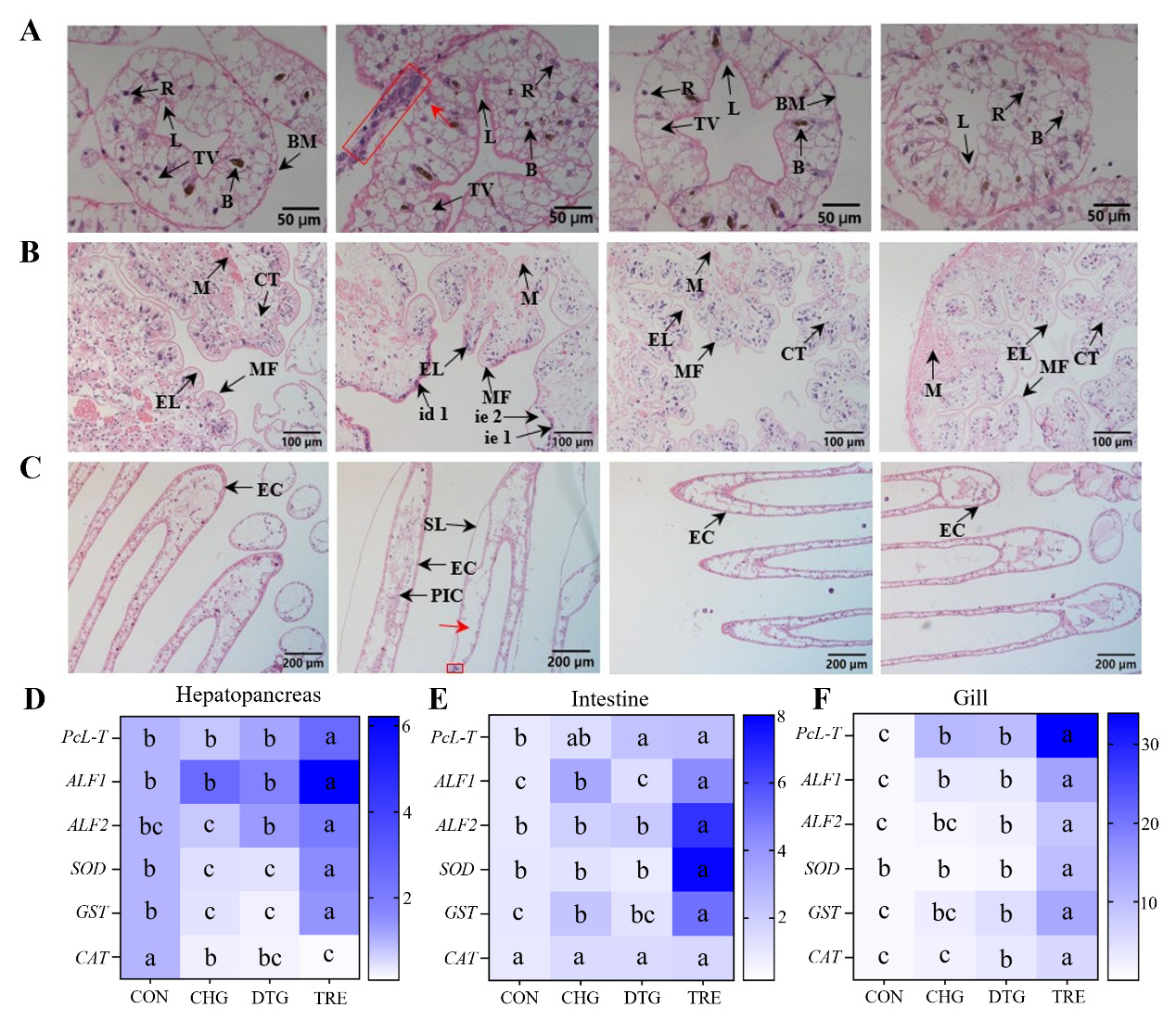 In the control group (CON), hepatopancreatic cells exhibited normal histological architecture, characterized by uniform cell distribution, normal volume of blasenzenllen cells (B cells) and their intracellular transport vesicles, intact hepatic tubules, and no signs of pathological changes such as inflammatory infiltration or cell necrosis. The virus-challenged group (CHG) exhibited significant pathological alterations, including dilated hepatic tubule lumens, extensive inflammatory cell infiltration (indicated by boxed area), enlarged storage cells, focal necrosis (indicated by red arrow), and reduced volume of both transport vesicles and B cells. Notably, the treatment group (TRE) showed significant tissue repair, characterized by reduced storage cell volume, a return of most storage cells to a morphology resembling the control state, restoration of hepatic tubule structure, absence of inflammatory or necrotic cells, and normal B cell size (Figure 2A).