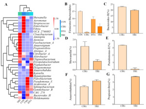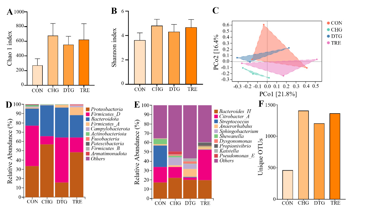 At the genus level, the only dominant genus (abundance >5%, same below) common to all groups was Bacteroides-H, with the largest proportion in the CHG group (22.22%), followed by the CON group (17.19%), the DTG group (20.11%), and the TRE group (19.79%). Citrobacter-A was a shared dominant genus among the CON, CHG, and TRE groups, with corresponding proportions of 16.7%, 11.45%, and 32.57%, respectively, but was present at a significantly lower proportion in the DTG group (2.2%). Streptococcus and Anaerorhabdus were the dominant genera in the CON (22.83%) and DTG (8.34%) groups, respectively. Sphingobacterium was the predominant genus in both the CHG (8.63%) and DTG (5.34%) groups. Shewanella was the dominant genus in the CON group (5.52%). Besides, the CHG group did not exhibit the presence of Streptococcus, Propionivibrio, while the CON group lacked Propionivibrio. Dysgonomonas, Kaistella, and Pseudomonas-E were common across all groups, although their relative abundance remained below 5%. Specifically, the proportions of Dysgonomonas and Kaistella in the DTG group were relatively high (2.76% and 2.92%, respectively), while Pseudomonas-E was most abundant in the CHG group (3.37%) (Figure 3E).