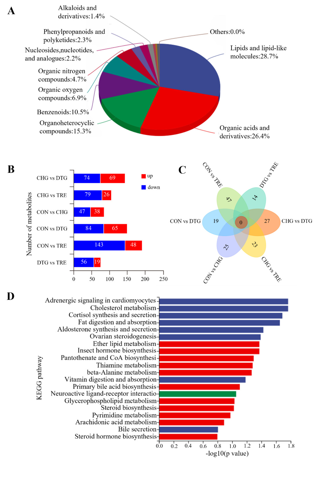 By conducting a differential analysis of metabolites between the CHG group and the TRE group, the primary biochemical metabolic pathways and signaling pathways involved were identified. The darker the red hue, the higher the likelihood of the pathway’s overall expression being upregulated; in contrast, the darker the blue hue, the higher the likelihood of the pathway’s overall expression being downregulated. The downregulated pathways mainly included cholesterol metabolism, bile secretion, cortisol synthesis and secretion, digestion and absorption of fats, aldosterone metabolism, and vitamin metabolism. The upregulated pathways included ether lipid metabolism, thiamine metabolism, beta-alanine metabolism, glycerophospholipid metabolism, pyrimidine metabolism, arachidonic acid metabolism, and the biosynthesis of pantothenate, CoA, insect hormones, primary bile acids, steroids, and steroid hormones (Figure 6D).
