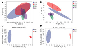 OPLS-DA, a form of multivariate statistical analysis, was employed in the present study to highlight distinctions among groups within the model, where the proximity of data points indicates similarity in metabolic profiles. OPLS-DA was employed to independently examine disparities between the CON and DTG groups, as well as between the CHG and TRE groups. The analysis revealed substantial differences, indicating that the treatment modified the gut metabolite composition in crayfish, likely related to alterations in the richness of the gut microbiome triggered by the medication (Figure 5C-D).