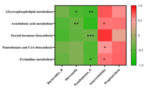 To elucidate the coordinated regulatory network established following the intervention with the herbal compound, we performed Spearman correlation analysis using experimental data from the TRE group. We observed a significant and consistent association pattern: herb-enhanced beneficial bacteria (such as Anaerorhabdus and Propionivibrio) showed significant positive correlations with multiple upregulated beneficial metabolites (including compounds from glycerophospholipid metabolism, arachidonic acid metabolism pathways, and CoA biosynthesis precursors) (|ρ| > 0.6, p < 0.05). Conversely, harmful bacteria that proliferated aberrantly during WSSV infection (such as Shewanella and Bacteroides-H) exhibited negative correlation trends with these beneficial metabolites (Appendix Figure 2).