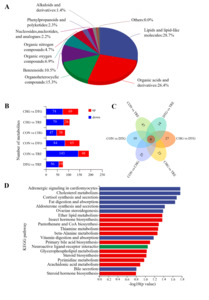 The classification of gut metabolites across groups revealed that lipids and lipid-like molecules comprised the largest proportion (28.7%), followed by organic acids and derivatives (26.4%), organoheterocyclic compounds (15.3%), organic oxygen compounds (6.9%), phenylpropanoids and polyketides (2.3%), alkaloids and derivatives (1.4%), benzenoids (10.5%), organic nitrogen compounds (4.7%), nucleosides, nucleotides and analogs (2.2%), and organic sulfur compounds (0.62%) (Figure 6A).