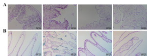Hepatopancreas, intestinal, and gill tissues were collected, fixed, embedded in paraffin, and sectioned using a microtome. For HE staining, tissue sections were deparaffinized and rehydrated. They were then stained with hematoxylin for nuclear visualization, followed by a differentiation step and bluing. The sections were subsequently stained with eosin to highlight the cytoplasm and extracellular matrix. After staining, the sections were dehydrated, cleared, and mounted with coverslips for microscopic observation. For AB staining, intestinal and gill sections were similarly processed. Following fixation, paraffin embedding, sectioning, deparaffinization, and rehydration, sections were stained with Alcian Blue, rinsed, counterstained with nuclear fast red, dehydrated, cleared, and cover-slipped. All treated sections were subsequently examined under a light microscope to evaluate histopathological alterations.