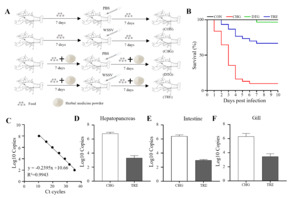 In the present study, crayfish were employed as an experimental model to evaluate the antiviral effects of a compound herbal formula comprising SB, FSI, and PV against WSSV. Our investigation focused on viral load, histopathological alterations, and the expression of innate immune-related genes in the hepatopancreas, intestine, and gills. Furthermore, changes in intestinal microbiota composition and metabolomic profiles were assessed. Overall, the results of this study offer potential candidate therapeutics for WSSV management in aquaculture and contribute to the scientific advancement of traditional Chinese medicine-based polyherbal formulations.
