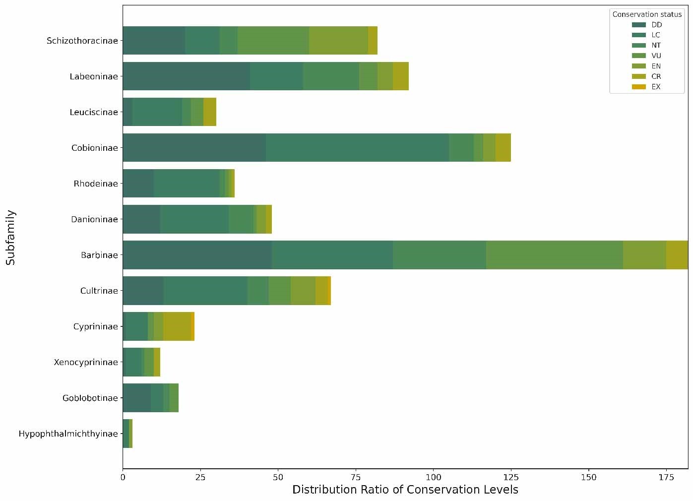The list assesses the extinction risk of Chinese freshwater fishes according to the categories and criteria of the IUCN Red List. In the IUCN Red List, species classified as Critically Endangered (CR), Endangered (EN), and Vulnerable (VU) are collectively referred to as threatened species. Of the 1591 assessed species, 358 are categorized as threatened, while 613 are considered non-threatened. For subsequent quantitative analysis, this study categorizes freshwater fish species by conservation status as follows: Least Concern (LC) = 0, Near Threatened (NT) = 1, Vulnerable (VU) = 2, Endangered (EN) = 3, Critically Endangered (CR) = 4, Extinct (EX) or Regionally Extinct (RE) = 5.