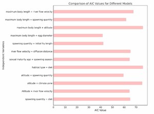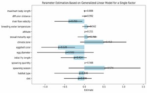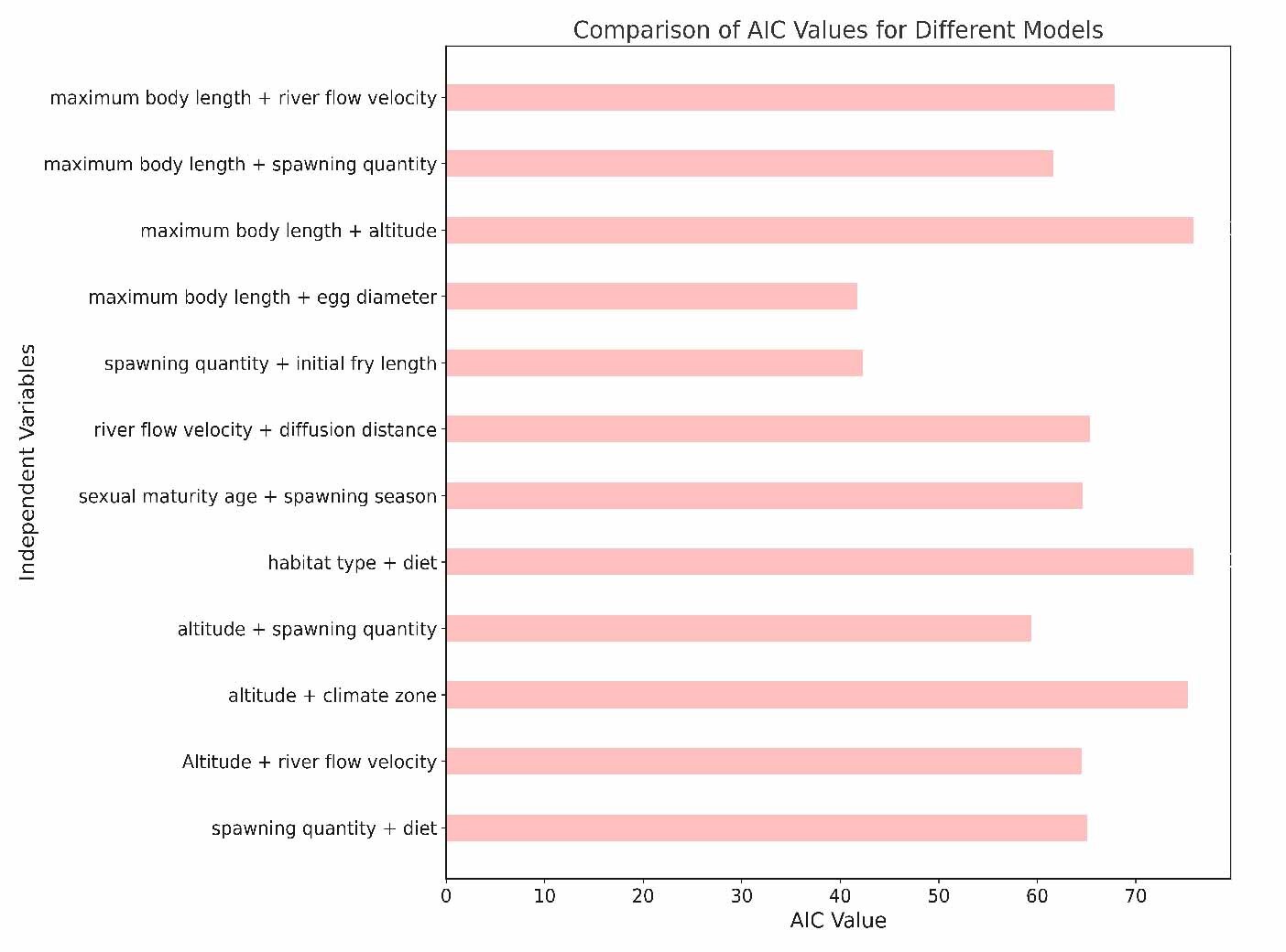 Then, we utilized the binomial distribution and the logit link function for data processing and modeled all possible combinations of characteristics and their interactions. By examining the Model Summary, we obtained crucial statistical information, including coefficient estimates, standard errors, z-values, and p-values. Finally, we used the Akaike Information Criterion (AIC) as the basis for model selection. Additionally, we calculated the AIC value to assess the predictive performance of the model.29 In this study, we initially considered 62 species of the Schizothoracinae subfamily. However, not all species had complete data for the variables of interest (e.g., body length, dispersal distance, spawning quantity, dietary habits). Therefore, we adopted a complete-case analysis approach, excluding species for which essential data were lacking for each specific model. This led to variations in the number of species included across different models. We acknowledge that this approach might have implications for the sample size and could potentially introduce bias into our findings. Hence, the interpretation of our results was made with careful consideration of these limitations, and we assessed the robustness of our conclusions by examining the consistency of results across different models.