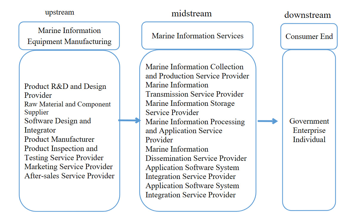 The marine information service industry chain is composed of nodes such as marine information collection/production service providers, marine information transmission service providers, marine information storage service providers, marine information processing service providers, marine information application service providers, marine information dissemination service providers, relevant marketing and after-sales service providers, and application software system integration service providers.