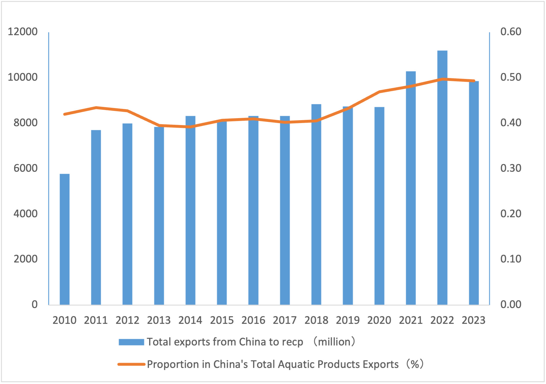 Overall, from 2010 to 2023, China’s exports of aquatic products to other RCEP member countries showed an expanding trend but with a slowing growth rate. In terms of export share, China’s exports of aquatic products to other RCEP member countries accounted for approximately 40% of China’s total aquatic product exports, fluctuating around this high level over the years. In the past five years, the growth trend has been strong, with the share approaching 50% in 2022 and 2023. In terms of export value, China’s exports of aquatic products to other RCEP member countries increased from USD 5,769.80 million in 2010 to USD 11,192.16 million in 2022, with an average annual growth rate of 5.23%, as shown in Figure 1.