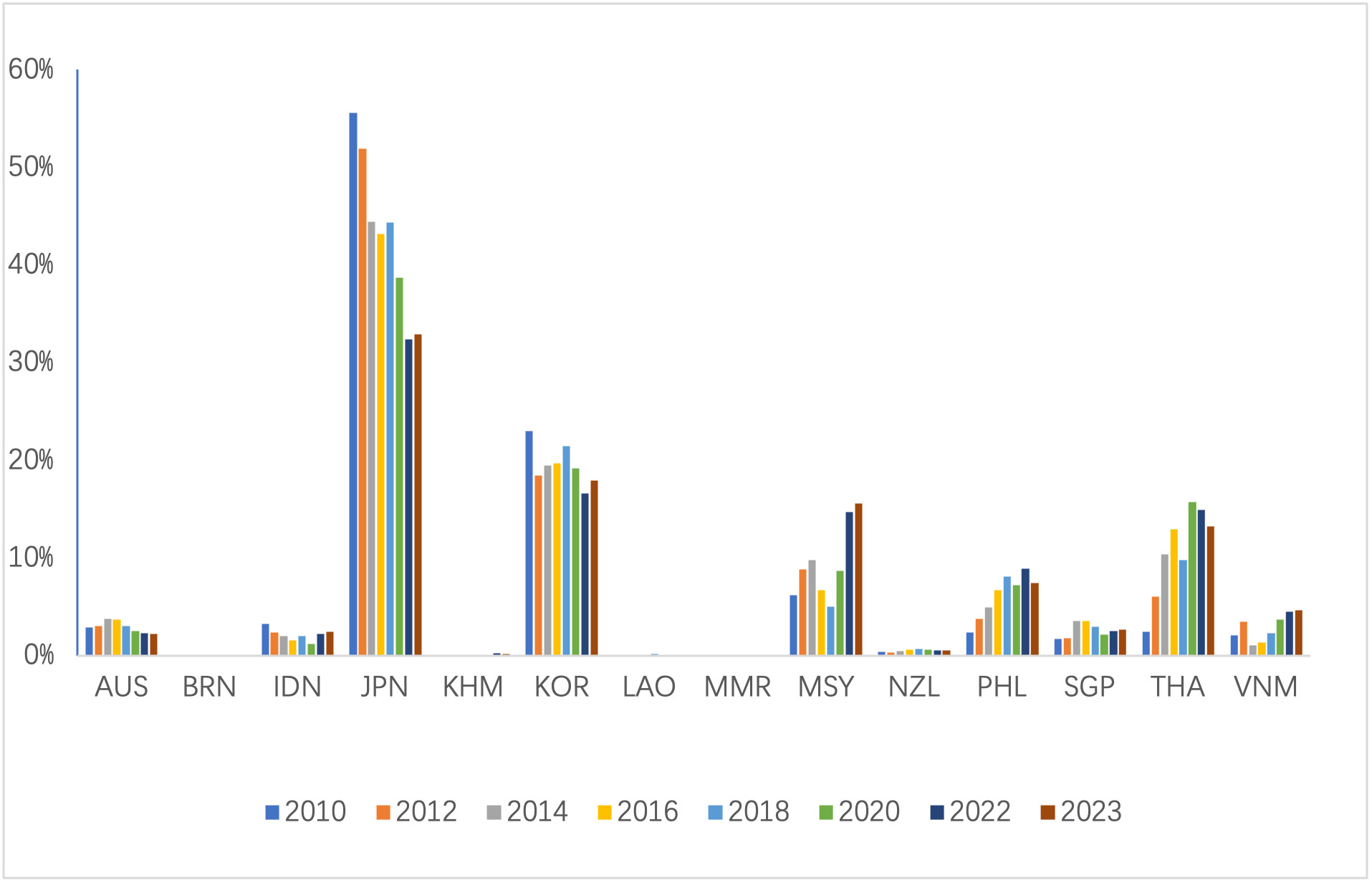 From the perspective of export market distribution, at the average level, among other RCEP member countries, Japan, South Korea, and Thailand are China’s top three aquatic products export markets. A horizontal comparison reveals that within the RCEP region, China’s aquatic products are primarily exported to Japan, South Korea, Thailand, Malaysia, and the Philippines, with Brunei, Cambodia, Laos, and Myanmar accounting for a smaller share. A vertical comparison shows that in recent years, the proportion of aquatic products exported by China to Japan and South Korea has been declining. Taking Japan as an example, in 2010, China’s aquatic products exports to Japan accounted for 55.58% of China’s total aquatic products exports to the entire RCEP region. By 2023, this proportion had decreased to 32.92%, a decline of 40.77%.