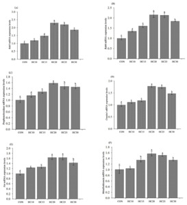 Therefore, we speculate that Houttuynia cordata, as a feed additive used in Chinese herbal medicine, can improve the phagocytosis and engulfment of blood cells and enhance bactericidal ability in vivo by increasing the activities of lysozyme and ACP in crayfish. Moreover, it can catalyze the conversion of its phenolic substrate to quinone species and improve immunity. In addition, it can improve the activity of AKP in crayfish, promote nutrient absorption and increase disease resistance. Thus, LZM, ACP, and AKP activities were significantly increased in the hemolymph and hepatopancreas, and PO activity was increased in the hepatopancreas of crayfish fed the HC15, HC20, HC25 and HC30 diets, which indicates that dietary HC could enhance immunity in crayfish.