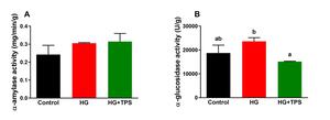 The effects of TPS on intestinal carbohydrate-digesting enzyme activities are presented in Figure 2. No significant differences were observed in α-amylase activity among the control, HG, and HG+TPS groups. However, dietary inclusion of TPS significantly reduced intestinal α-glucosidase activity compared to the HG group (p < 0.05).
