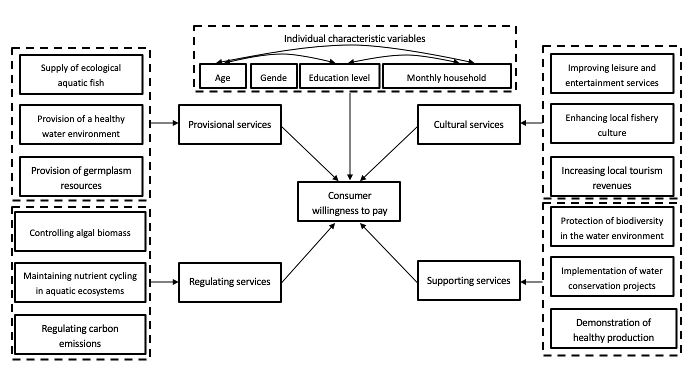 This paper selects multiple dimensions of freshwater fish ecosystem services and individual characteristics as explanatory variables based on the existing studies. The multiple dimensions of freshwater ecosystem services include provisional, regulating, cultural, and supporting services, and consumer personal characteristics include age, gender, education, and income. The definitions of variables and their representative letters are shown in Table 3.