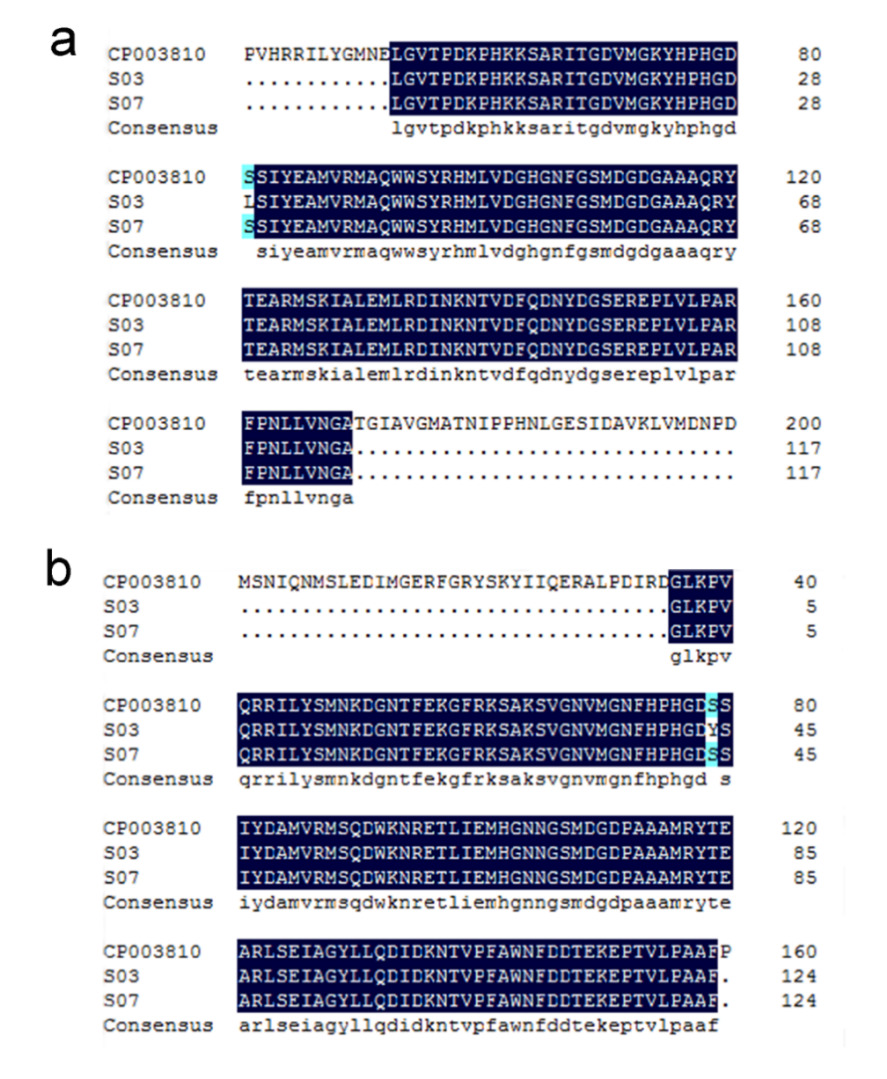 Results of three repeated antimicrobial susceptibility tests for GBS S03 and S07 are given in Table 2. Antimicrobial tests revealed that GBS S03 showed drug resistance against macrolide, fluoroquinolone and tetracycline. In this study, a set of 12 antimicrobials was employed, and it was shown that S03 exhibited resistance to 7 of these antimicrobials, resulting in a resistance rate of 58.3%. By contrast, GBS S07 was sensitive to 11 tested antibiotics except enrofloxacin (intermediate), the resistance rate in this study was 0. The results indicated that the drug resistance of GBS S03 was stronger than that of S07 and had multiple drug resistance.