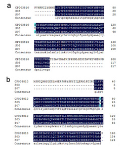 Characteristics of the two genomes are summarized in Table 1. The circular maps of the two strains showed that the genome of GBS S03 was 2,156,979 bp in length (Figure 1a), while that of GBS S07 was 1,790,578 bp (Figure 1b). The genome sequence of both strains showed 35% G+C contents. RAST server predicted the 2,160 and 1,641 CDSs for GBS S03 and S07 strains, respectively. Based on the COG classification of GBS S03 and S07, 23.7% and 22.6% of CDSs in GBS S03 were responsible for information storage and processing, whereas 37.5% and 39.4% of CDSs in GBS S07 were for metabolism (Figure 2). The genome sequences of GBS S03 and S07 have been deposited in the NCBI GenBank database under the accession numbers NAPX00000000 and NHZY00000000, respectively.