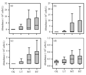 The abundance of the four dominant phytoplankton species, namely Pseudanabaena sp., Microcystis wesenbergii, Aphanizomenon flosaquae, and Chlorella sp., followed a similar increasing pattern across the different terrigenic treatments in the experiment (Figure 5). In the CK treatment, the mean abundance of Pseudanabaena sp., Microcystis wesenbergii, and Chlorella sp. was recorded as (0.11 ± 0.10) × 107, (0.09 ± 0.21) × 107, and (0.17 ± 0.06) × 107 cells/L, respectively. However, in the MT treatment, their abundance increased significantly to (11.16 ± 16.90) × 107, (5.09 ± 7.65) × 107, and (0.39 ± 0.38) × 107 cells/L, respectively (Figure 5a, b, d). Similarly, the abundance of Aphanizomenon flosaquae increased from (0.05 ± 0.11) × 107 cells/L in the CK treatment to (3.10 ± 3.54) × 107 cells/L in the HT treatment (Figure 5c). The abundance of all four dominant species was significantly (P < 0.05) higher in the MT and HT treatments compared to the CK treatment.