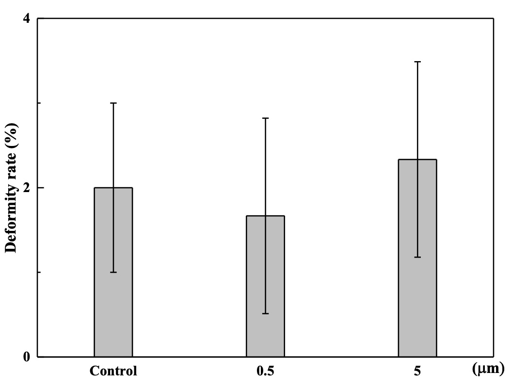 The results indicated that 104 items/L PS (0.5 µm and 5 µm) may improve the hatching rate when compared to the control during the hatching process (P<0.05), but there was no significant difference at the end of the hatching process (P>0.05, Figure 2). There was no significant difference in the deformation rate across the treatments (P>0.05, Figure 3).